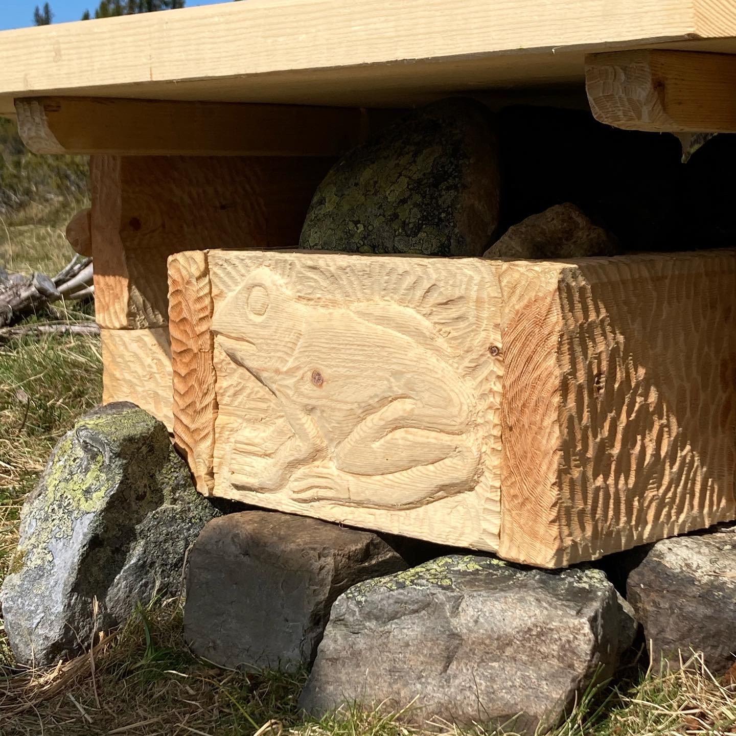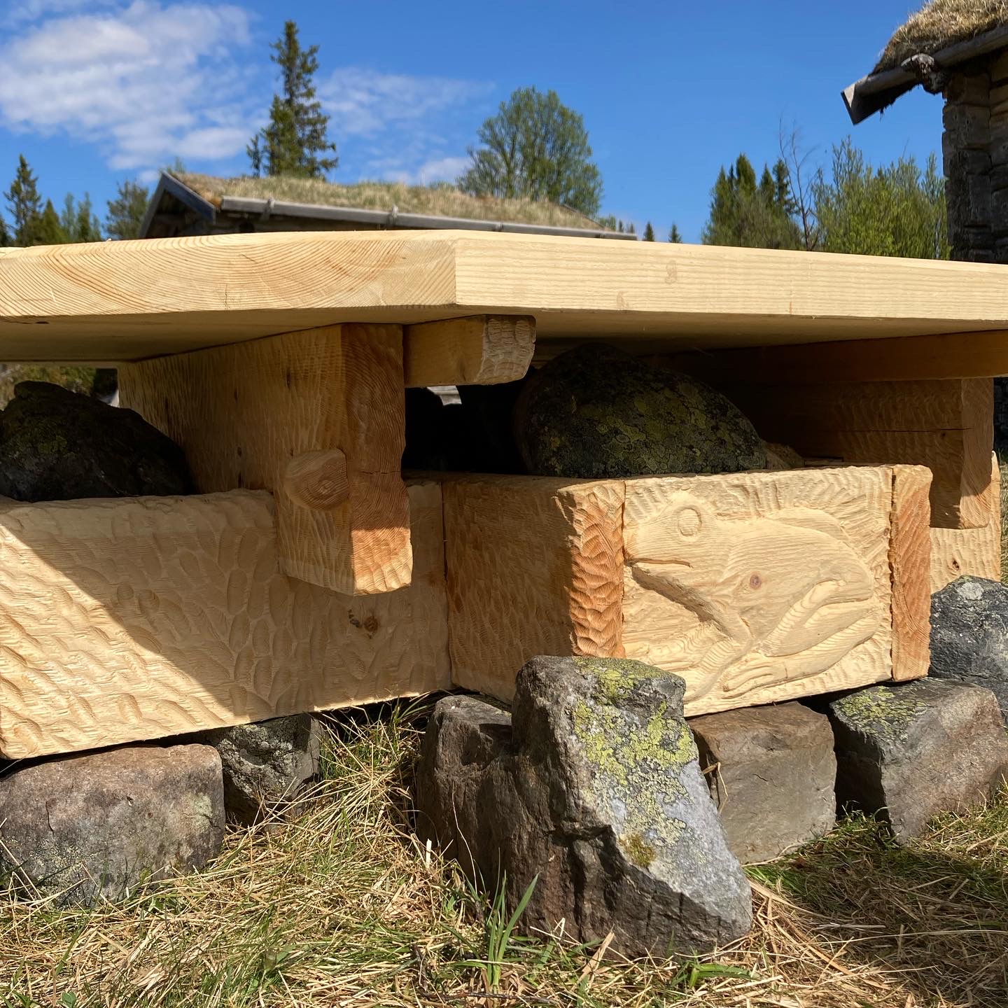 Public sculpture Konstgödning. Östra Arådalen, Jämtland. Collaboration with Björn Dahlström, Felix Dahlström Persson, Annika Persson The sculpture is placed in an area of wooden cottages on the mountain side where cows grass in June. The houses are of untreated wood and so is the bench we have placed there. Apart from the end pieces that have gotten a bit of linseed oil. The bench will therefor slowly transform into the same gray wooden being as all of the houses on this mountain side in Östra Arådalen.